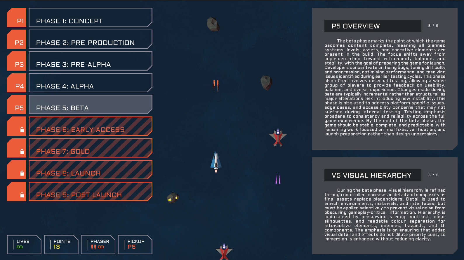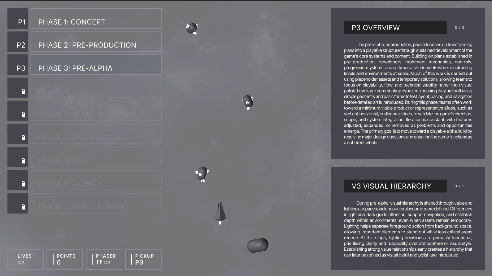 Pipeline Protocol is a space-shooter in which progression is tied to the game production pipeline. As players progress, each pickup unlocks a new stage of development, linking production activities to key production principles alongside theories of visual hierarchy and supporting auxiliary information. Collecting a pickup immediately upgrades the game’s visuals and mechanics, allowing players to experience the impact of pipeline decisions in real-time. Through this structure, Pipeline Protocol functions as a fast, clear, and engaging learning tool, showing how games evolve from greybox foundations to completed releases through play.