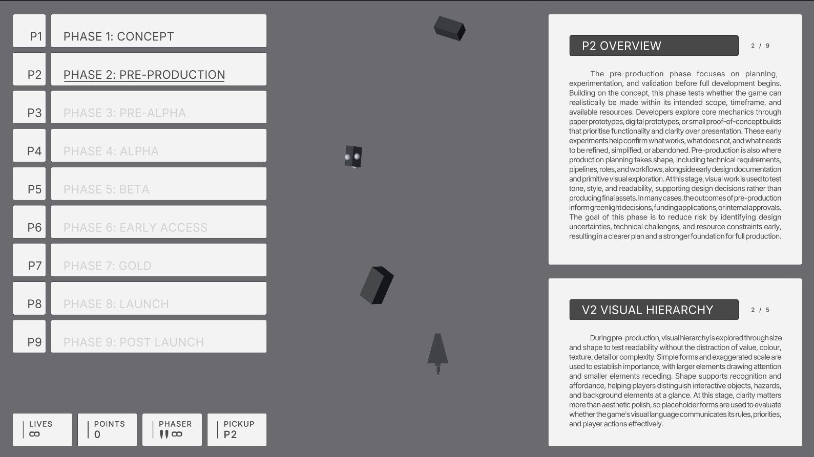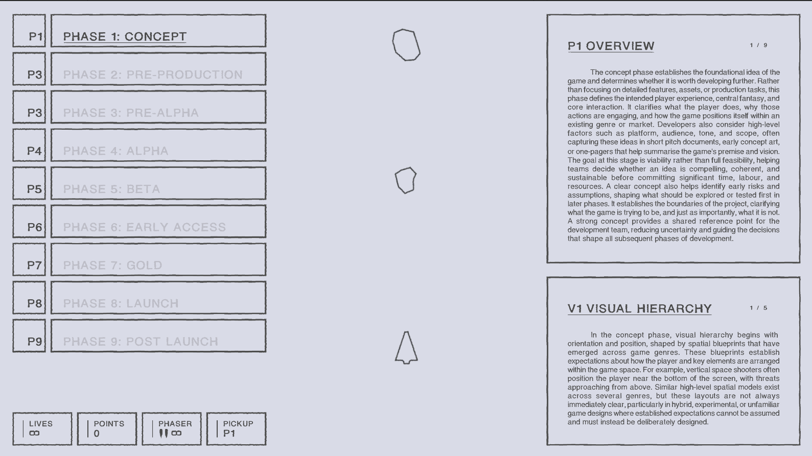 Pipeline Protocol emerged in response to this pedagogical gap. The project was originally inspired by conversations with game developer and educator Dr Justin Carter, which explored how visual attention and visual hierarchy shape player experience, readability, and a player’s perception of a game. These discussions highlighted the role of visual hierarchy as a structuring logic that guides attention and establishes order, rather than functioning purely as an aesthetic concern. This insight provided the foundation for exploring how production phases might be communicated through visual change and interaction.